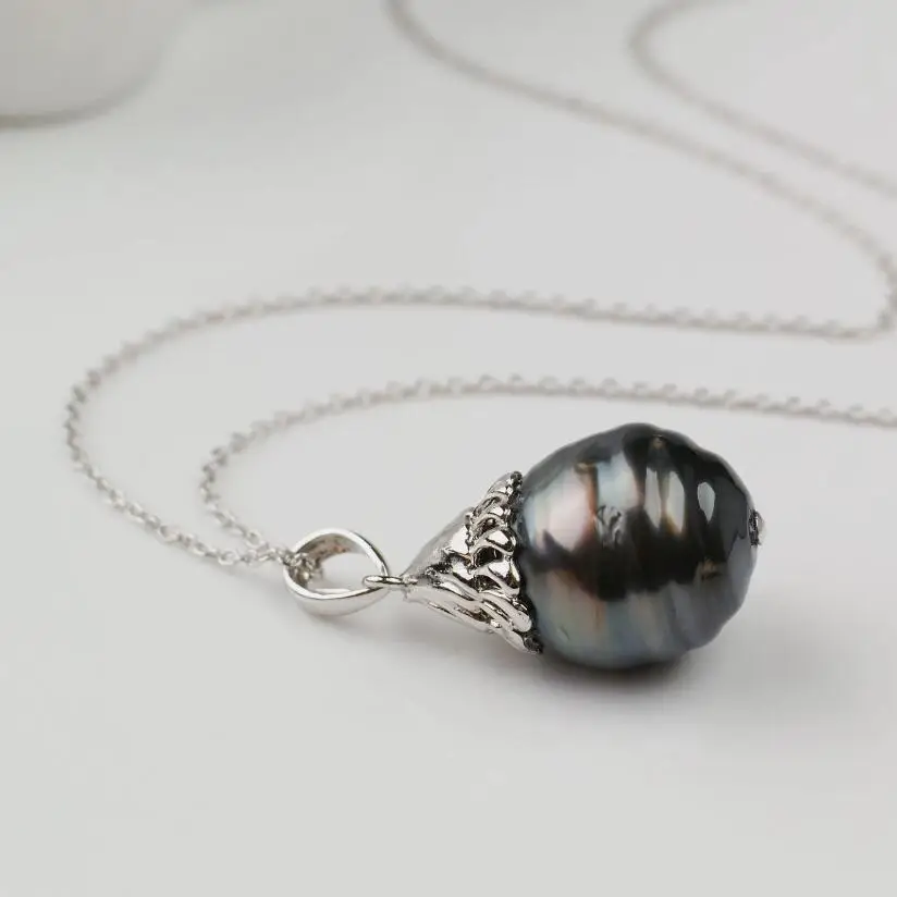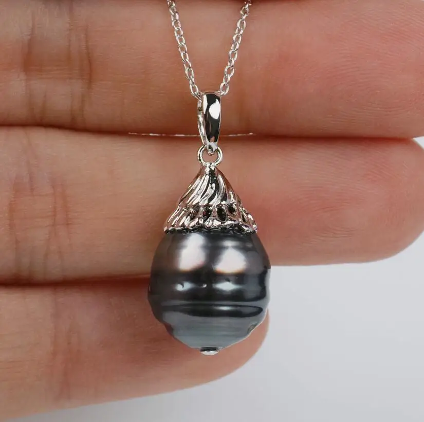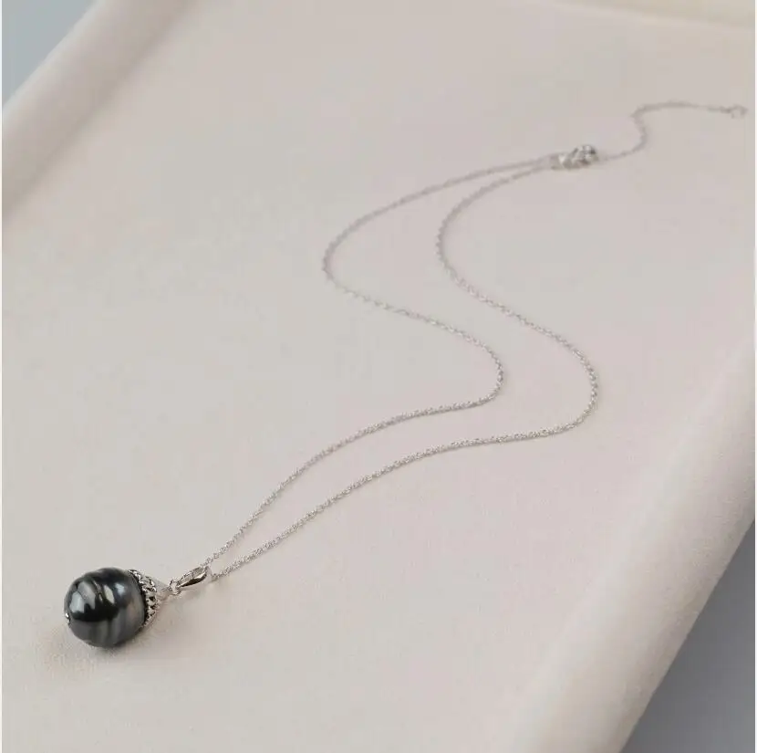 13-11mm Black Tahitian South Sea Pearl Pendant Necklace Sterling Silver