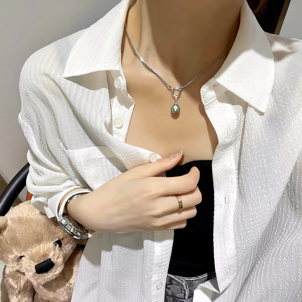 9-10mm Real Seawater Tahitian Black Pearl with 925 Silver Snake Chain Pendant
