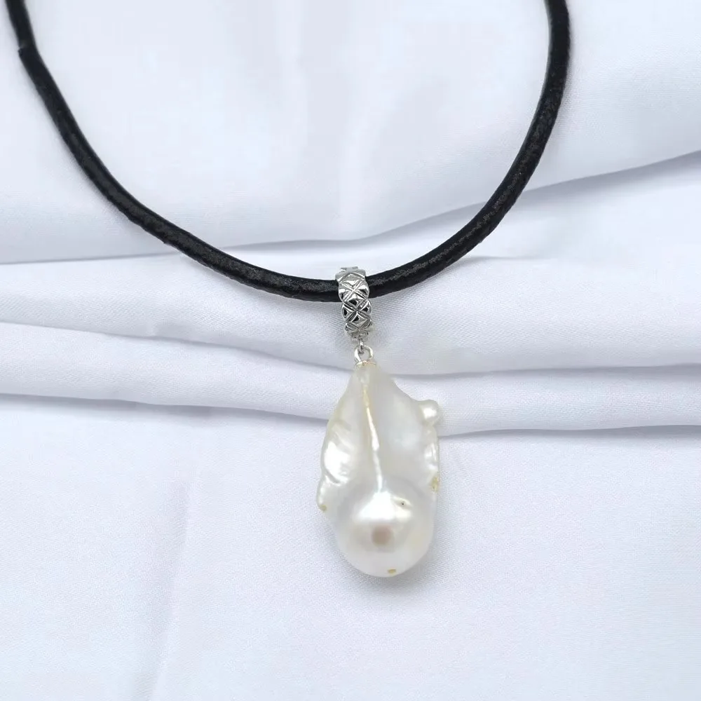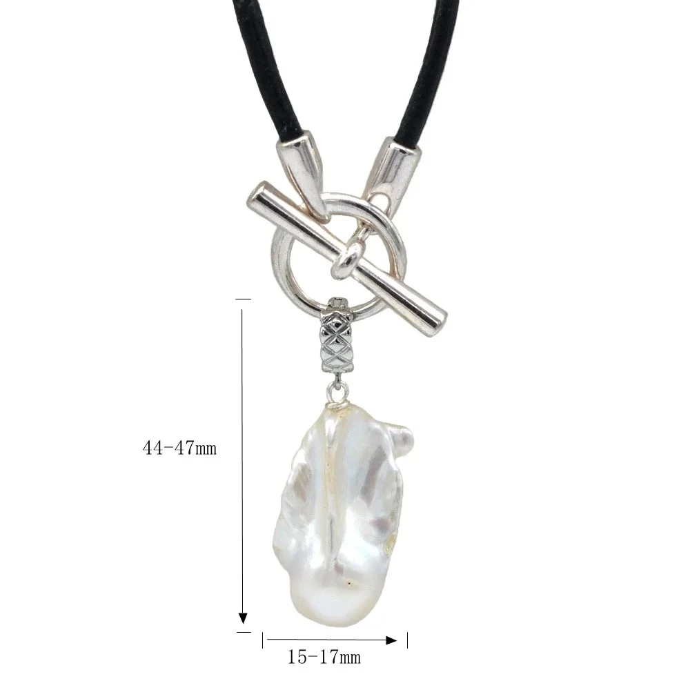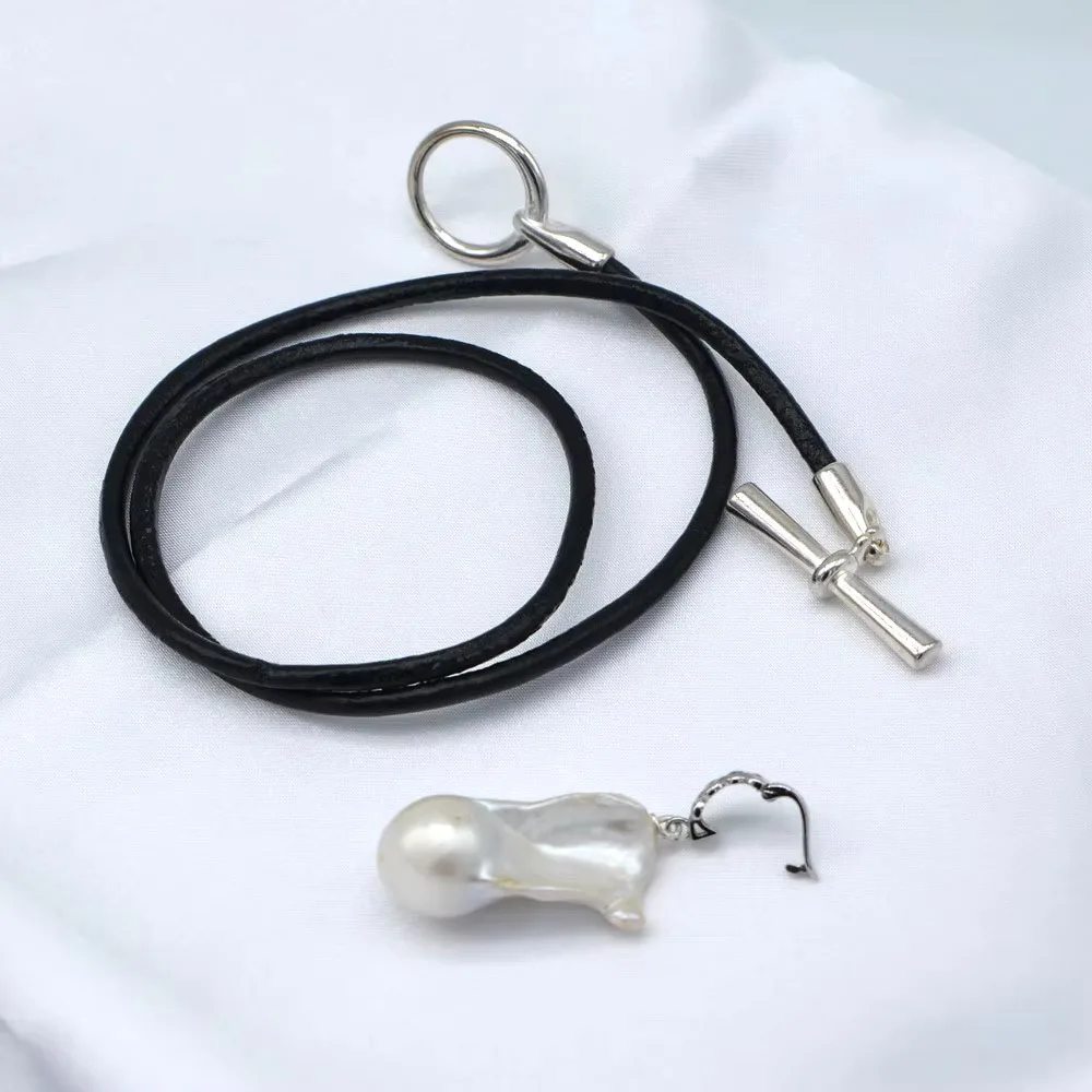 White Natural Baroque Large Pearl Pendant OT Buckle Black Leather Necklace