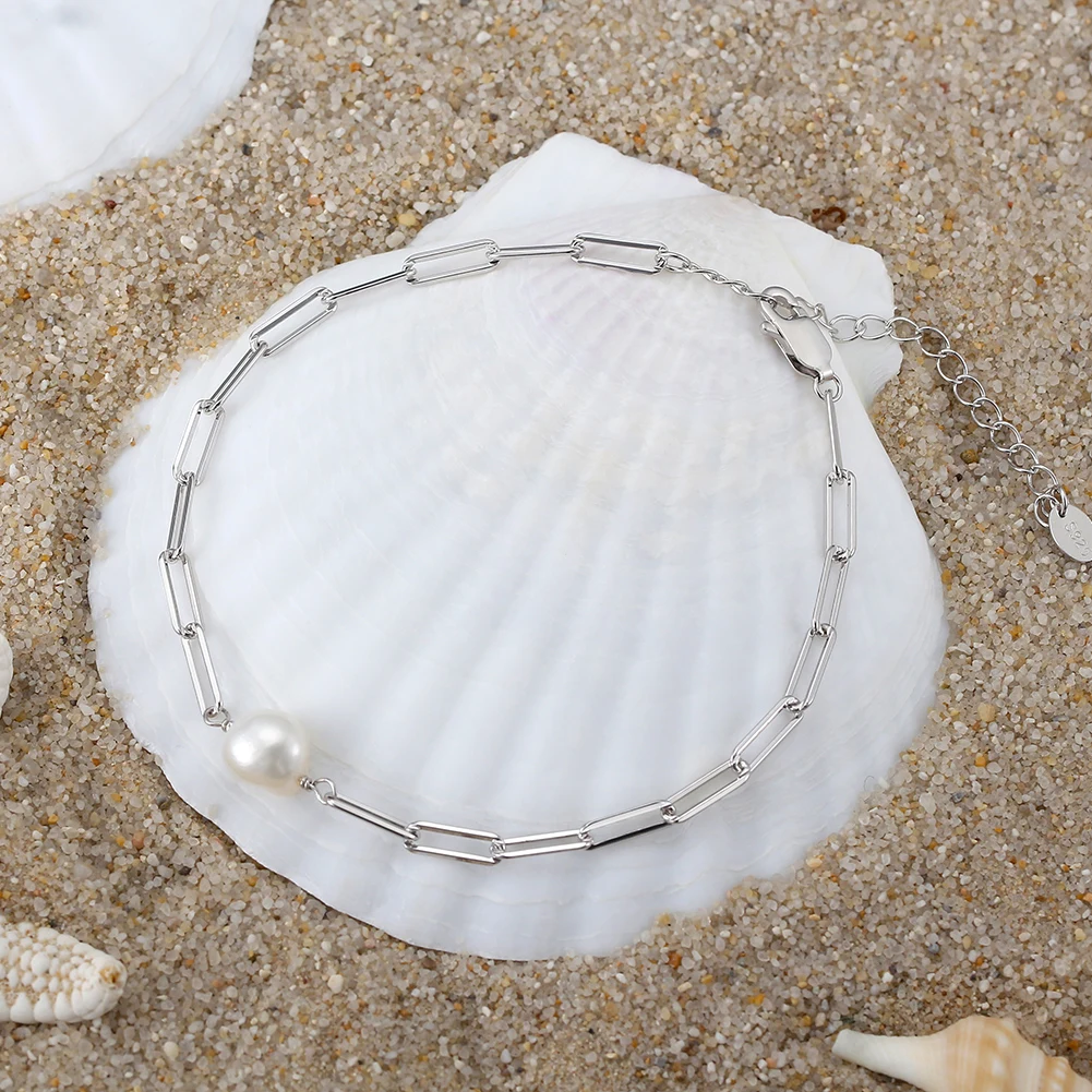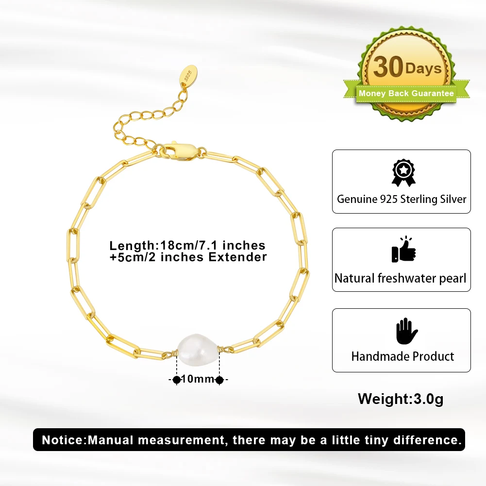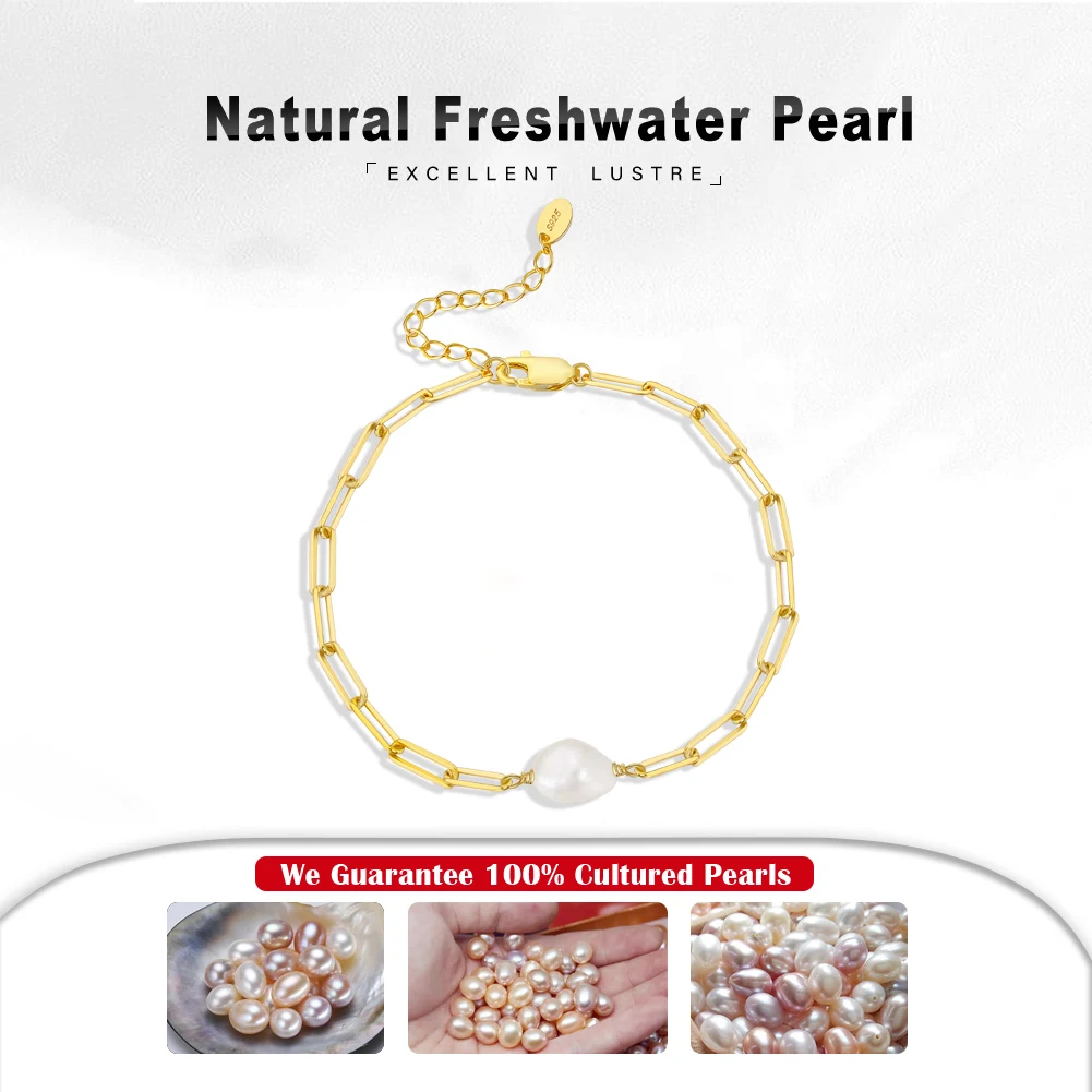 925 Sterling Silver Natural Freshwater Pearl with Paperclip Vintage Chunky Link Chain Bracelet for Women